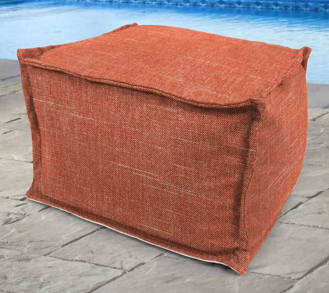 Outdoor boxed edge pouf ottoman cushion; UV protection allows cushion to withstand up to 500 hours of direct sunlight; Filled with dense polystyrene beads; Weather resistant polyester fabric that is engineered to withstand mold, mildew, & stains; Overall