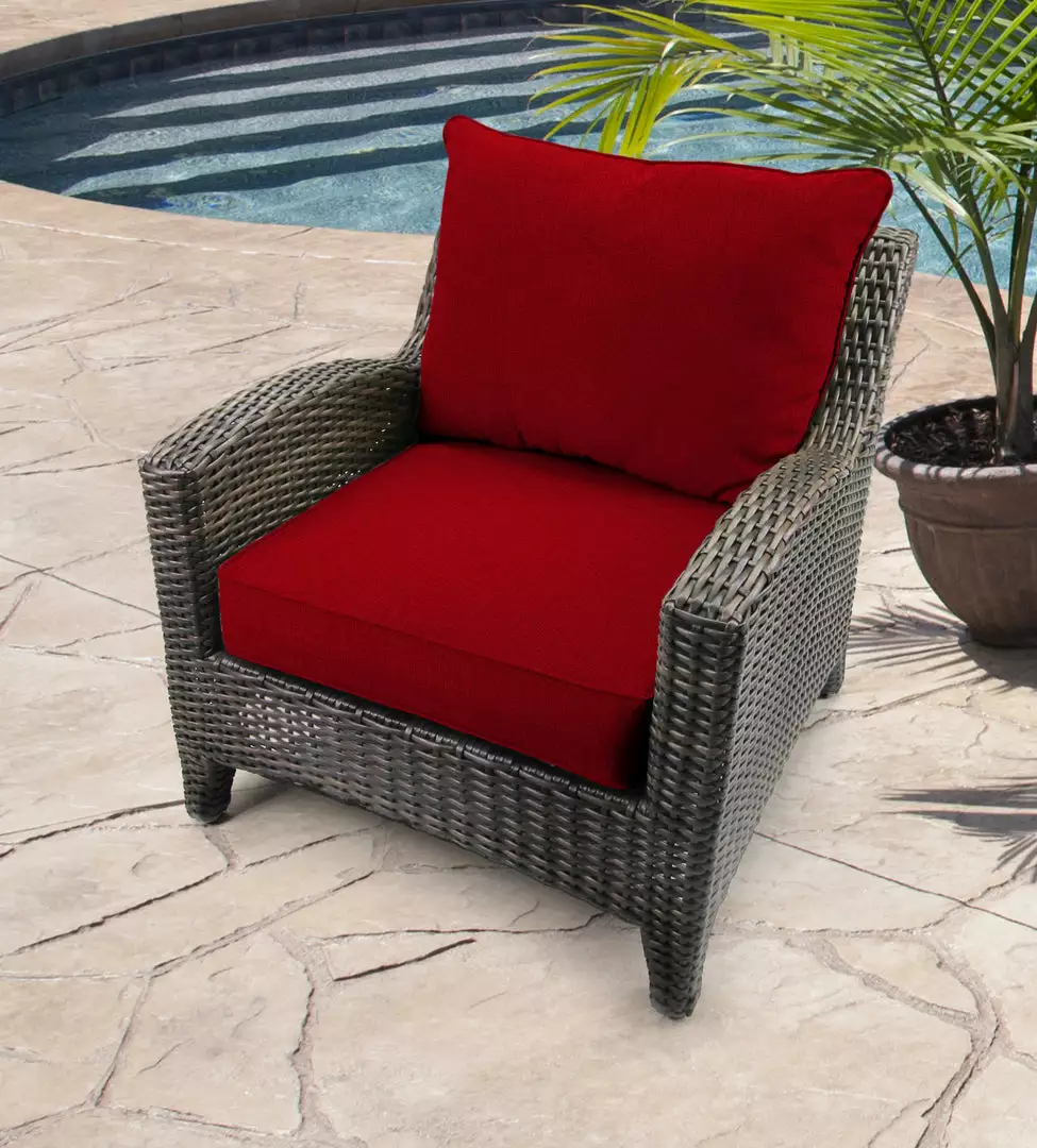 Outdoor 2PC Deep Seat Chair Cushion; Boxed edge seat with matching welt; Knife edge pillow backing; UV protection allows cushion to withstand up to 500 hours of direct sunlight; Seat is filled with dense polyurethan foam wrapped in hypoallergenic polyester fiber; Back is filled with hypoallergenic blown polyester fiber; Made from weather-resistant polyester fabric that is engineered to withstand mold, mildew, & stains; Seat dimensions: 24Wx24Lx6H; Back dimensions: 26.5Wx22.5Lx6H
