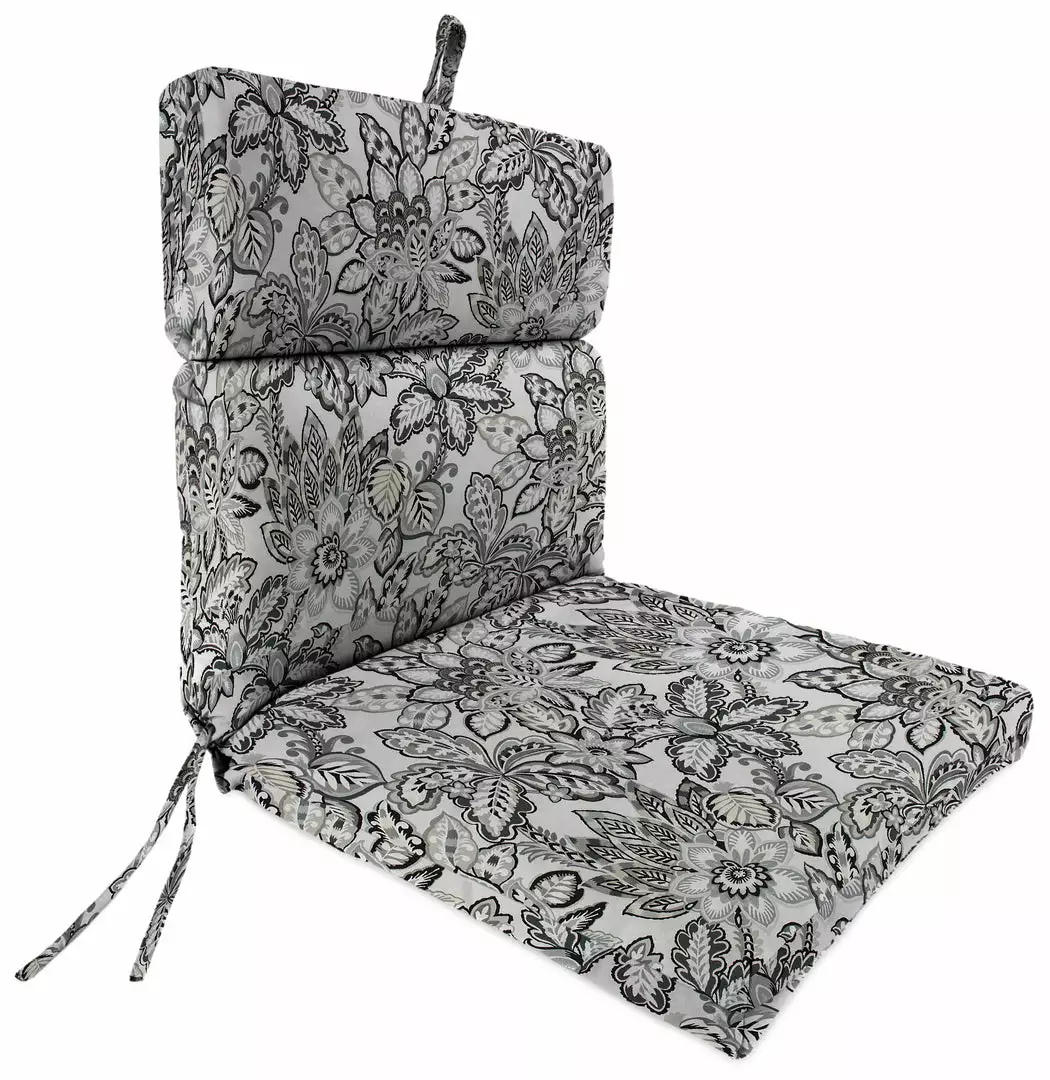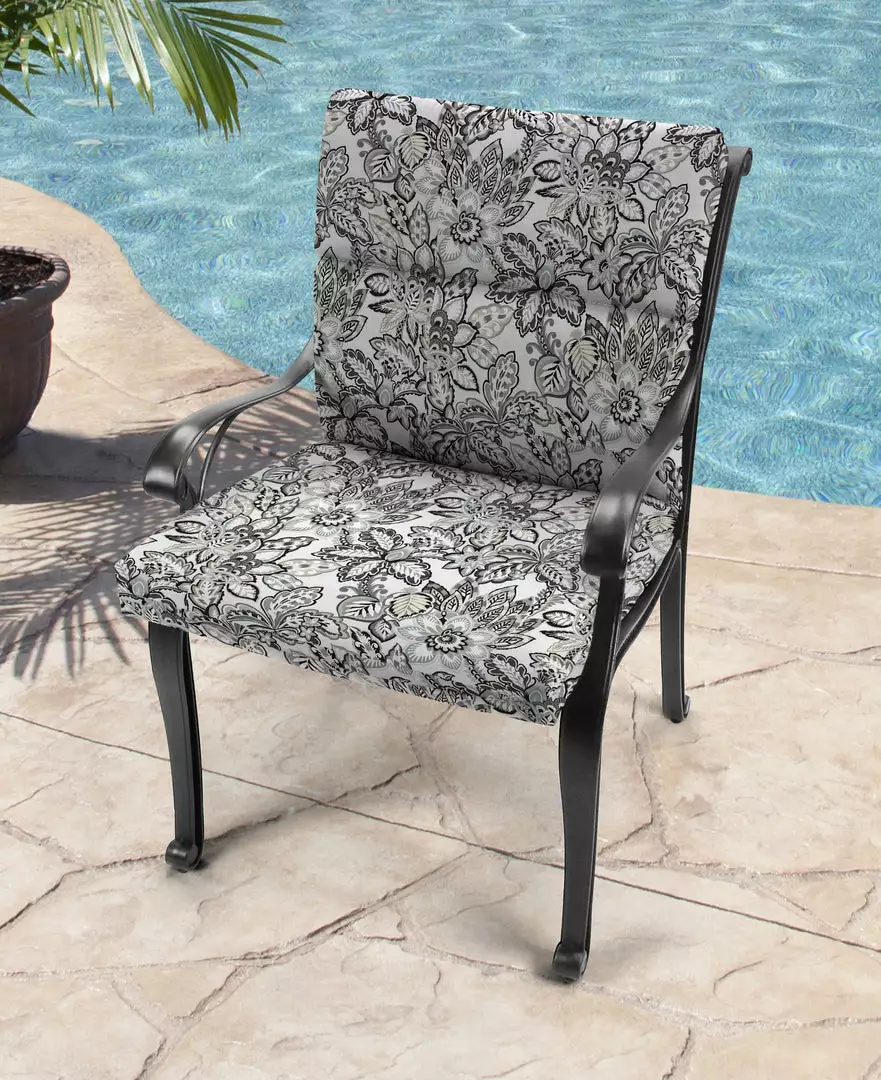 Outdoor French edge dining chair cushion; UV protection allows cushion to withstand up to 500 hours of direct sunlight; Filled with dense hypoallergenic layered fiber; Weather resistant polyester fabric that is engineered to withstand mold, mildew, & stains; Overall dimensions: 22Wx44Lx4H; Seat dimensions: 22Wx22L; Back dimensions: 22Wx22L with 9.5″ head hinge; Matching ties for a secure fit and hanger loop for easy storage