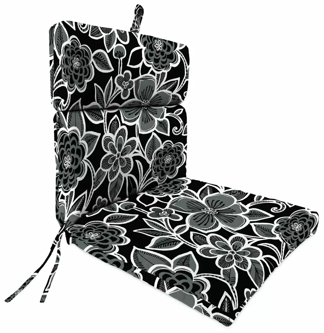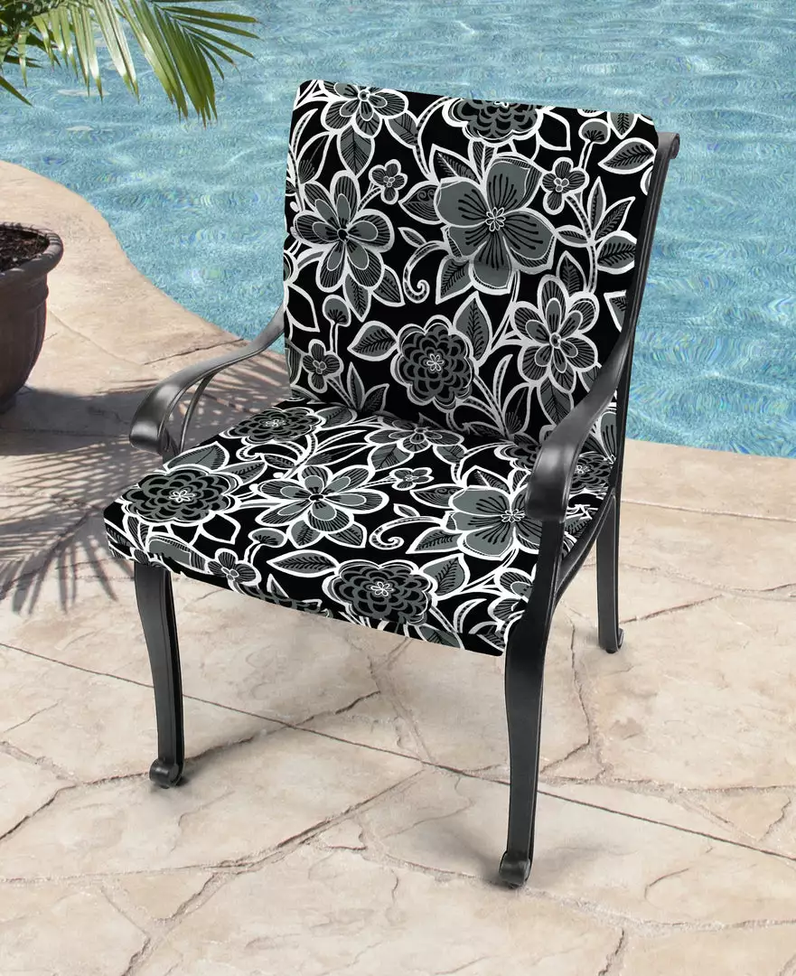 Outdoor French edge dining chair cushion; UV protection allows cushion to withstand up to 500 hours of direct sunlight; Filled with dense hypoallergenic layered fiber; Weather resistant polyester fabric that is engineered to withstand mold, mildew, & stains; Overall dimensions: 22Wx44Lx4H; Seat dimensions: 22Wx22L; Back dimensions: 22Wx22L with 9.5″ head hinge; Matching ties for a secure fit and hanger loop for easy storage