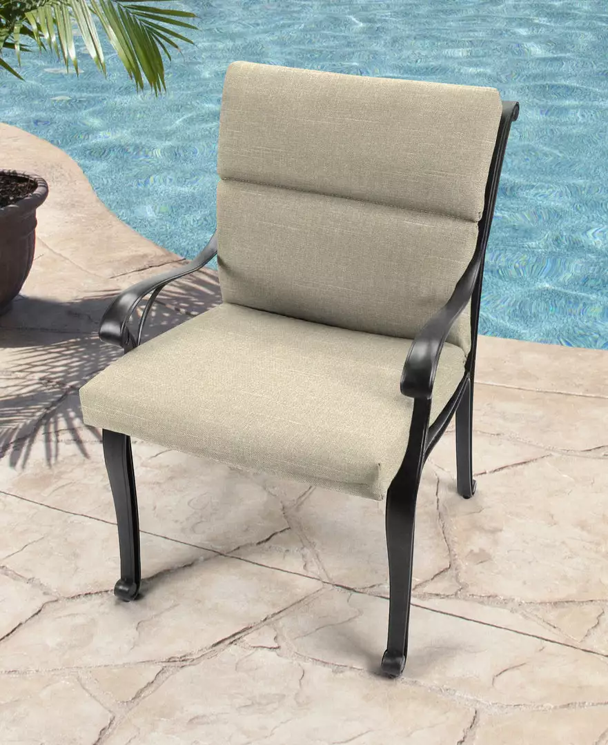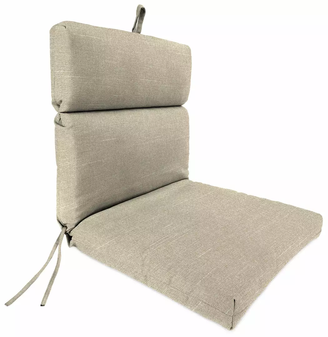 Bring additional style and comfort to your patio decor with our Outdoor French edge dining chair cushion from Jordan Manufacturing. This classic piece can be used to brighten up any outdoor seating area for the utmost comfort. Its larger size serves as a casual seat when the guest list suddenly grows. 100% polyester material makes for a high-performance fabric with its weather-, fade- and water-resistant qualities, making for the perfect piece to put outdoors. From elaborate dining spaces to cozy three-season porches, this fiber-filled cushion boosts your space with carefree, laid-back style and total comfort.