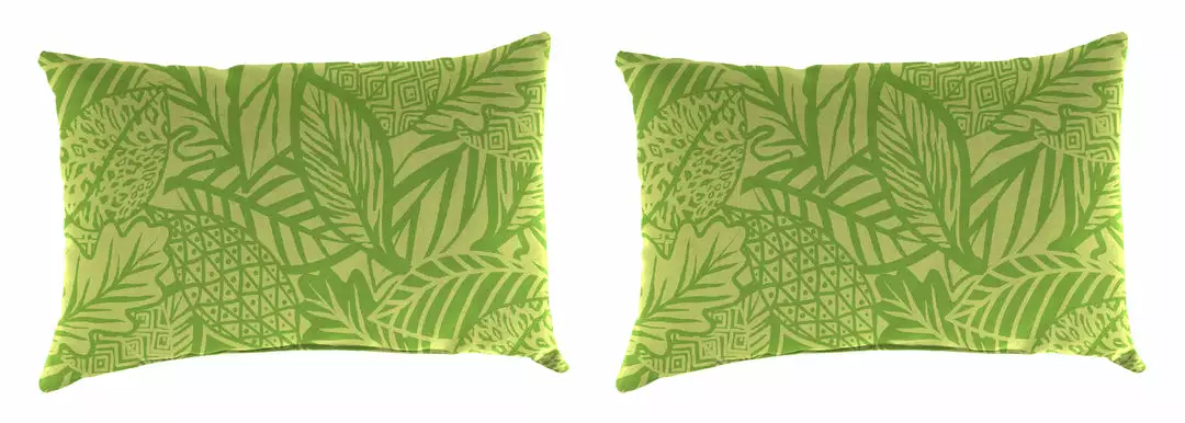 Add a touch of color to your outdoor seating area with this set of 2 Outdoor Lumbar Throw Pillows from Jordan Manufacturing. Crafted from a quick-drying, UV- and water-resistant fabric, these outdoor pillows withstand sun exposure and the elements to last for the seasons to come. Stuffed with hypoallergenic polyester fiber fill for an extra cushy and soft experience while relaxing. From elaborate dining spaces to cozy three-season porches, these fiber-filled throw pillows boosts your space with carefree, laid-back style and total comfort.
