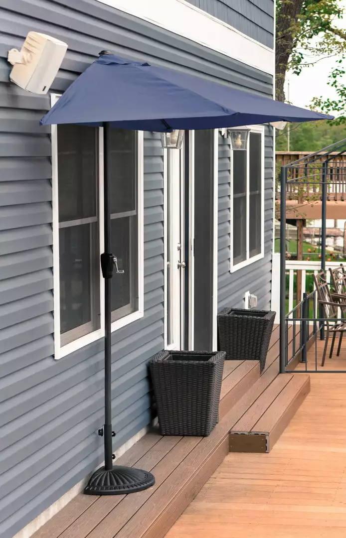 Our half umbrella can provided unlimited time spent outdoors with its wide span of shade protection. Great for small decks, patios, or balconies. Made with spun polyester fabric to prolong the life of your outdoor umbrella and comes equiped with a hand crank for easy opening. Engineered to Resist Fading, Mildew & Stains.